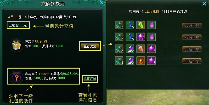 2012年4月1日以后开启的新区将有战力礼包领取哦!