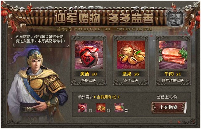 活动期间,玩家可通过祭祀、征收、攻敌分别获得3种食材,按比例上交即可获得丰厚奖励