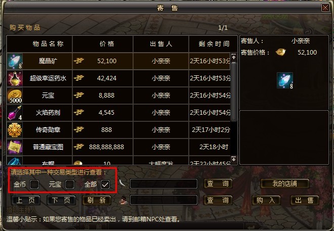 选择金币,则在物品列表中只显示以金币为价格单位寄售的物品;选择元宝,则在物品列表中只显示以元宝为价格单位寄售的物品;选择全部则显示所有的寄售物品。